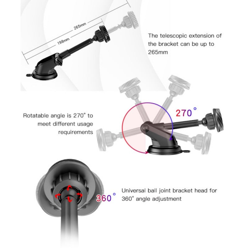 Saugnapf-Basis: Der Saugnapf sorgt für eine stabile und sichere Befestigung auf glatten Oberflächen wie dem Armaturenbrett oder der Windschutzscheibe. Der Saugnapf ist leicht zu installieren und kann mehrfach verwendet werden, ohne an Haftfähigkeit zu verlieren.