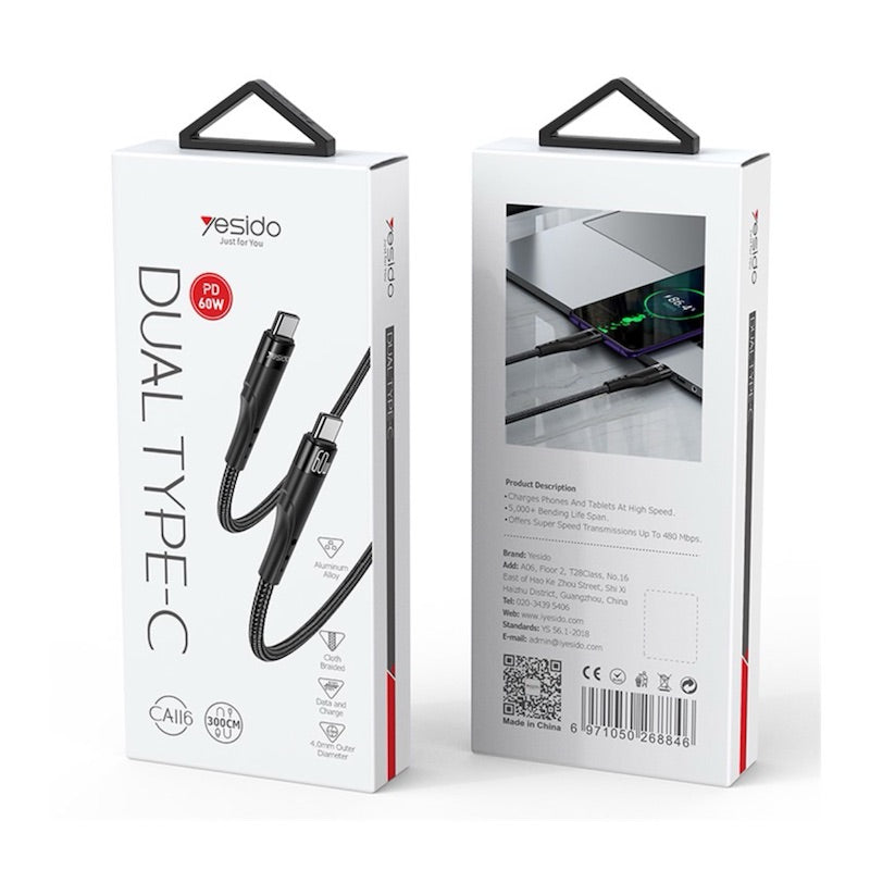 YESIDO CA116 Typ C zu Typ C 3 Meter Ladekabel
